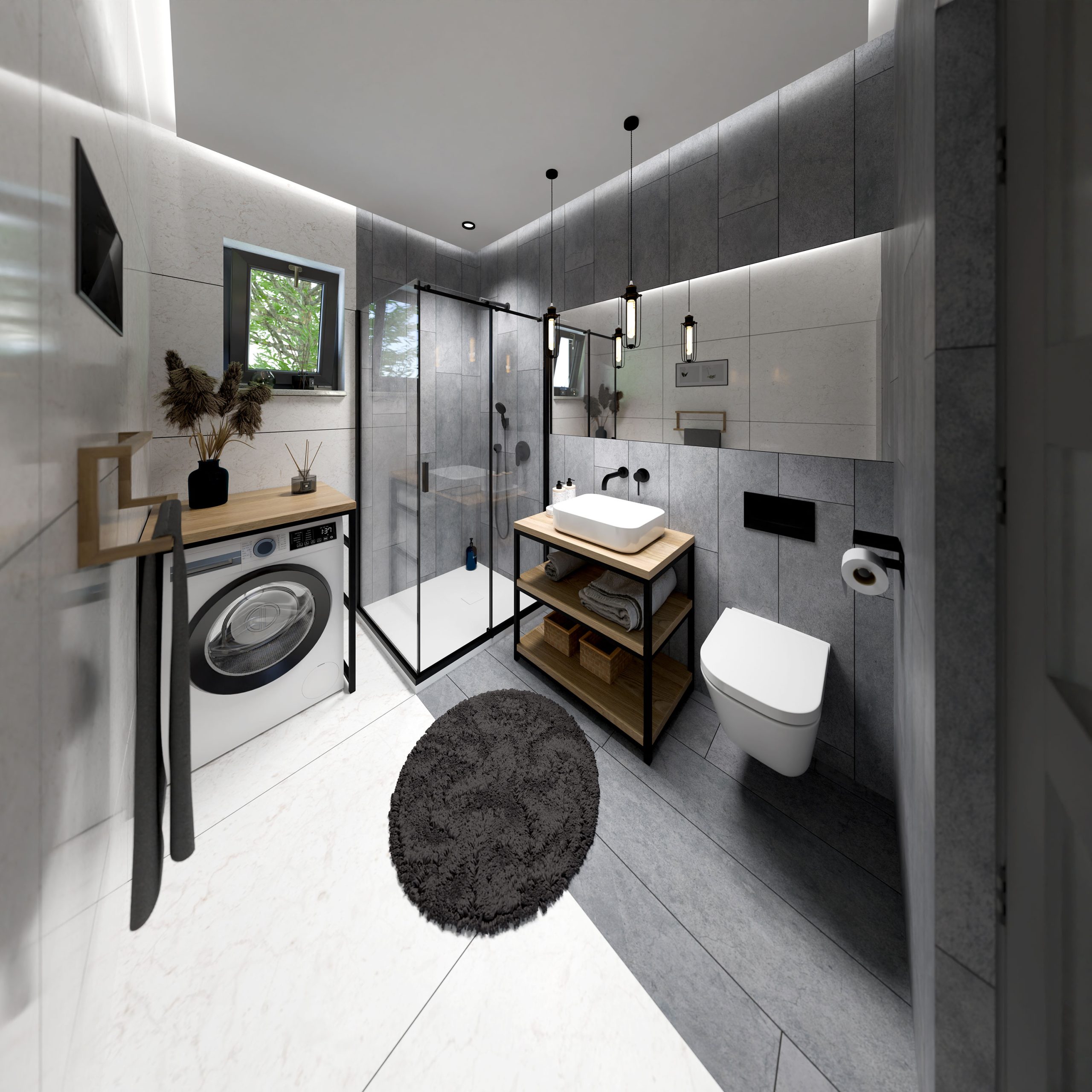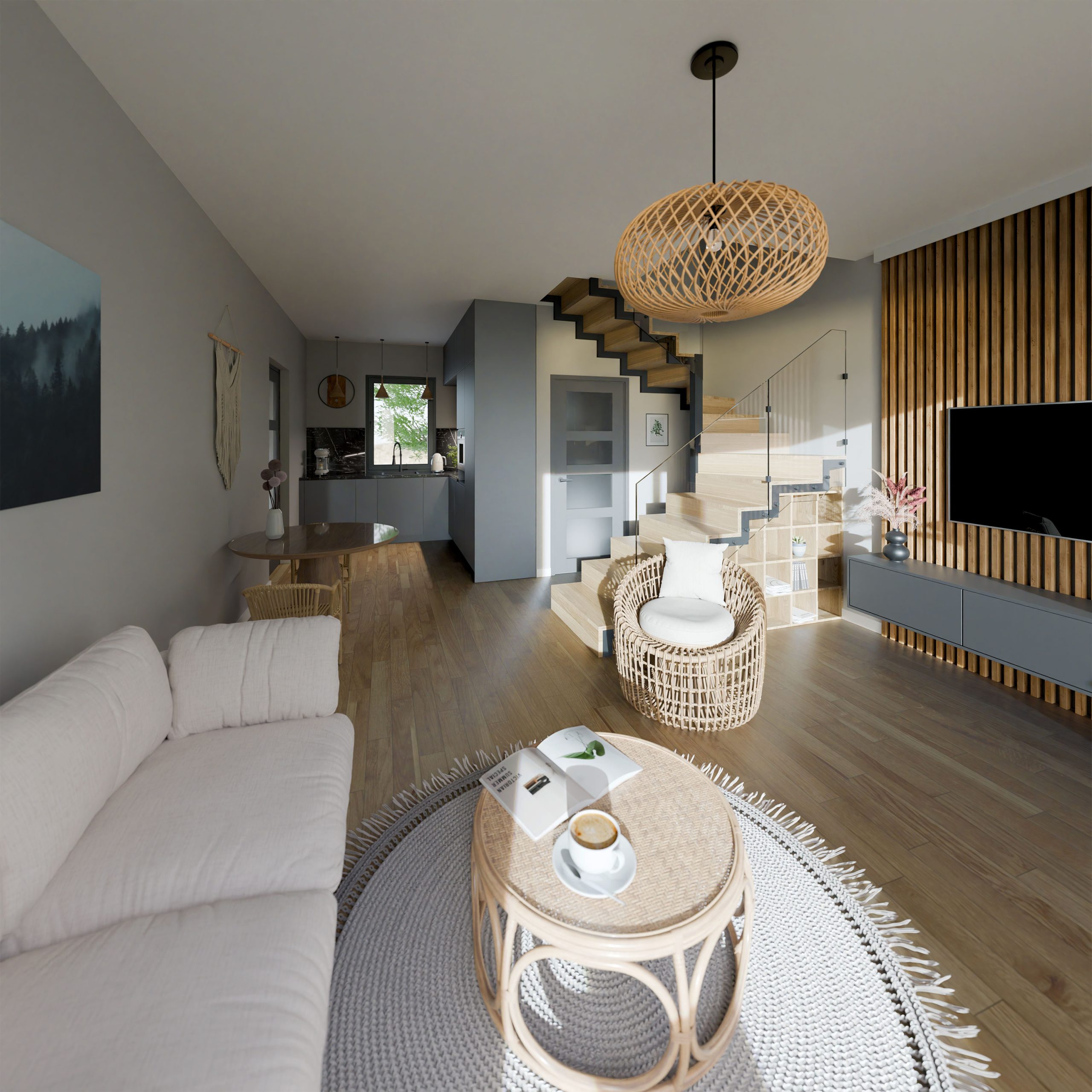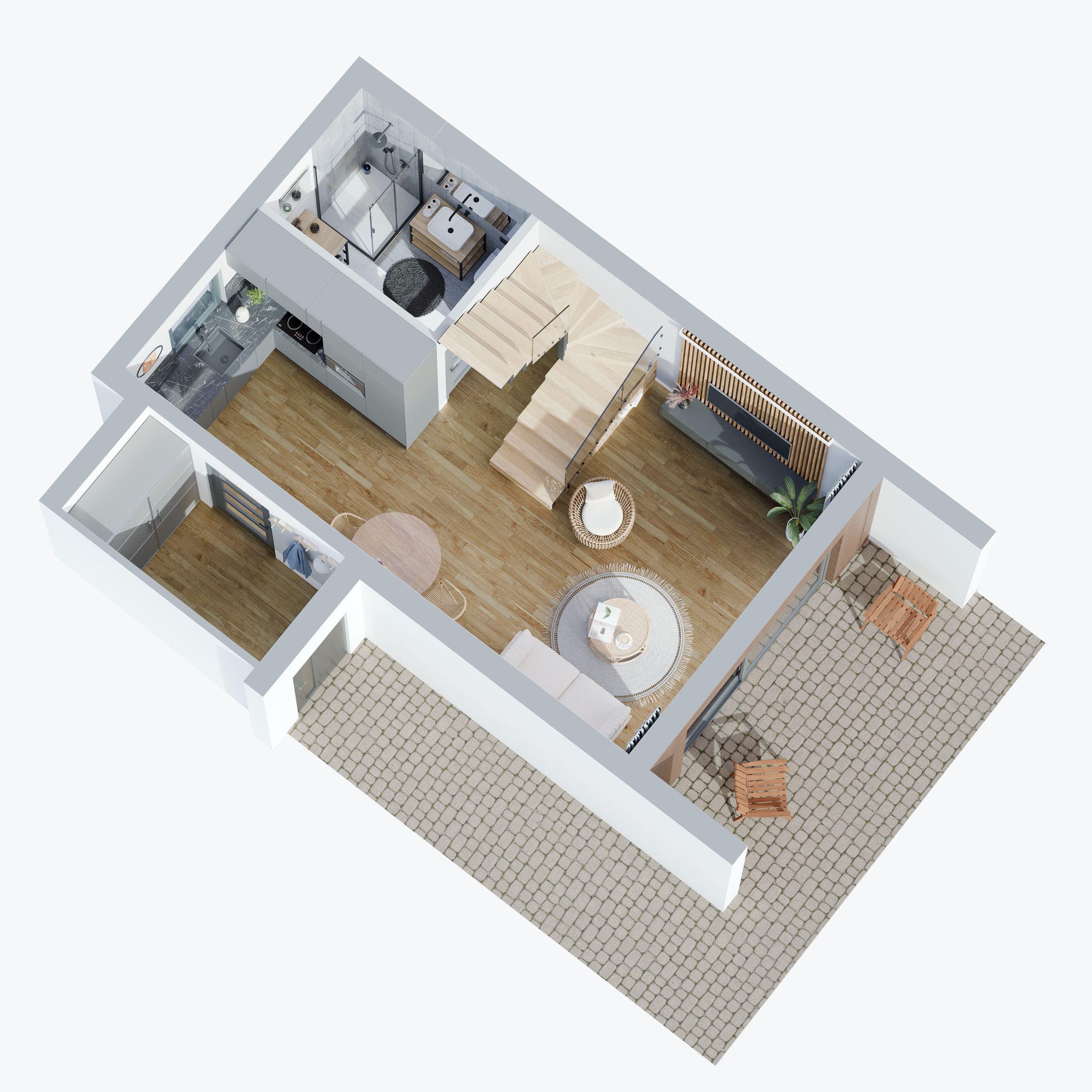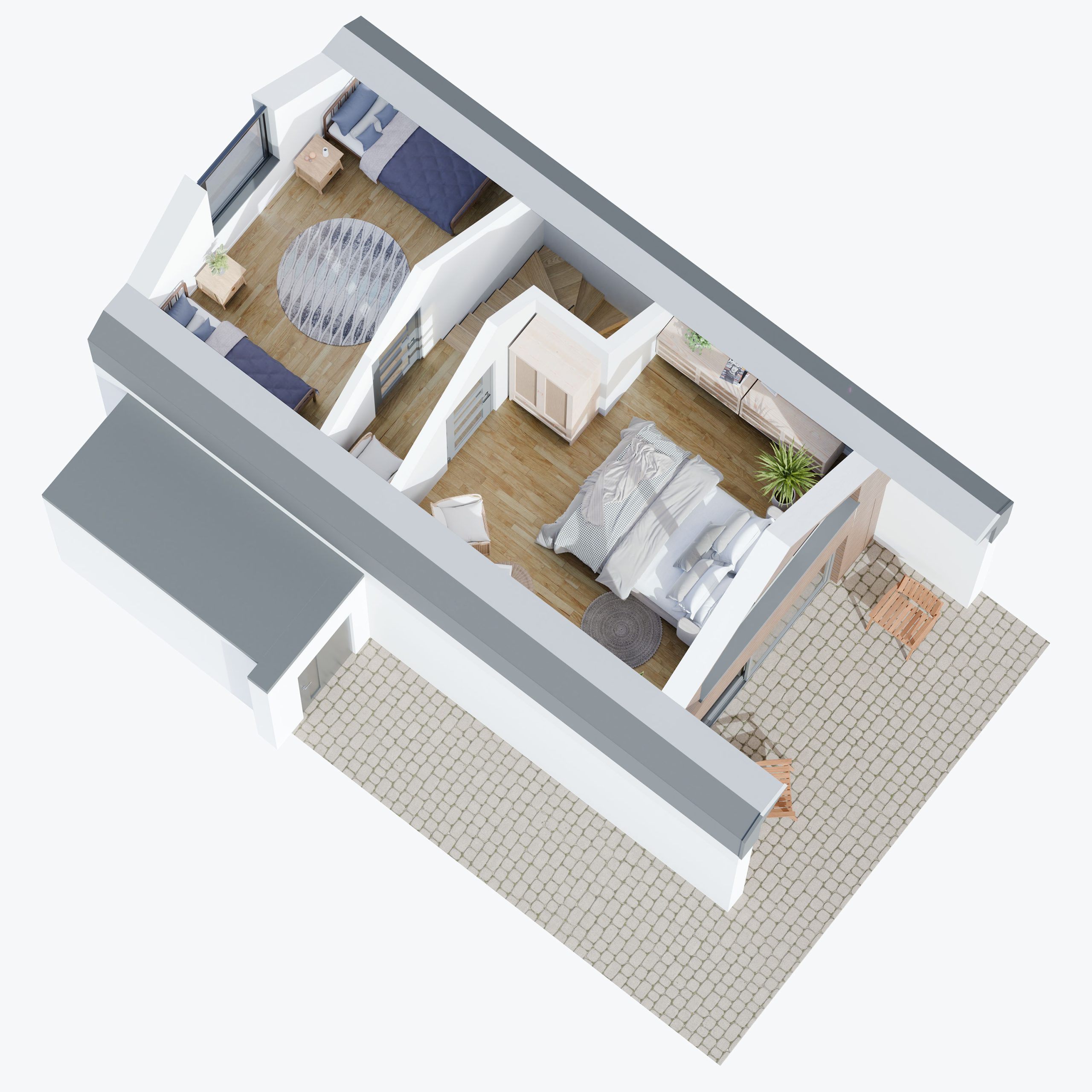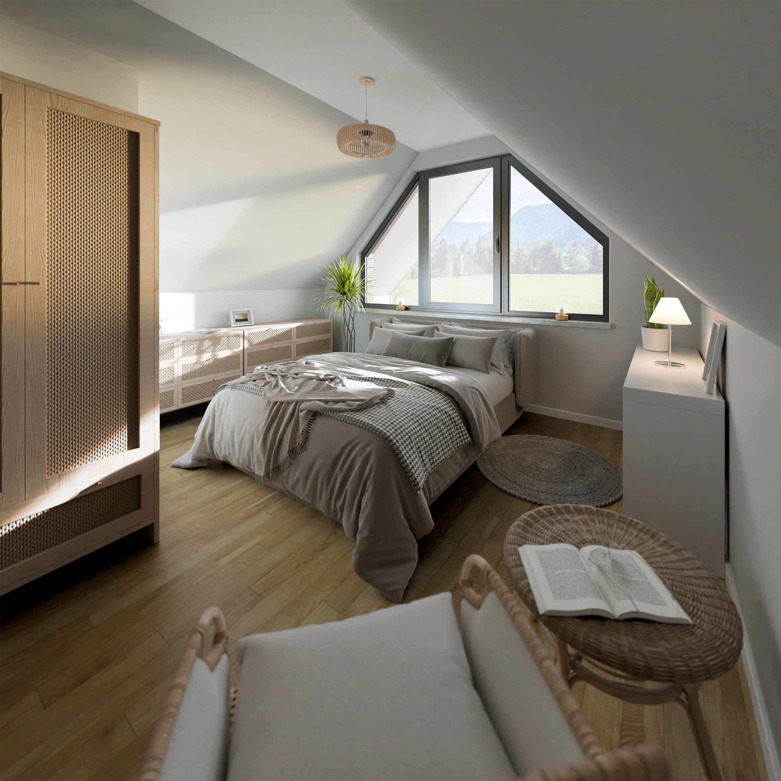 wizualizacja 3D wnętrz mini domu w górach.